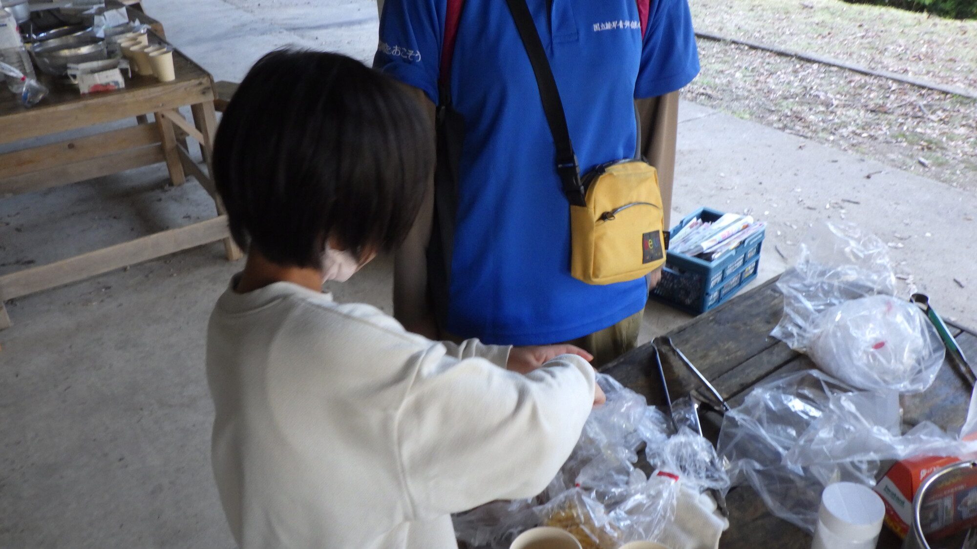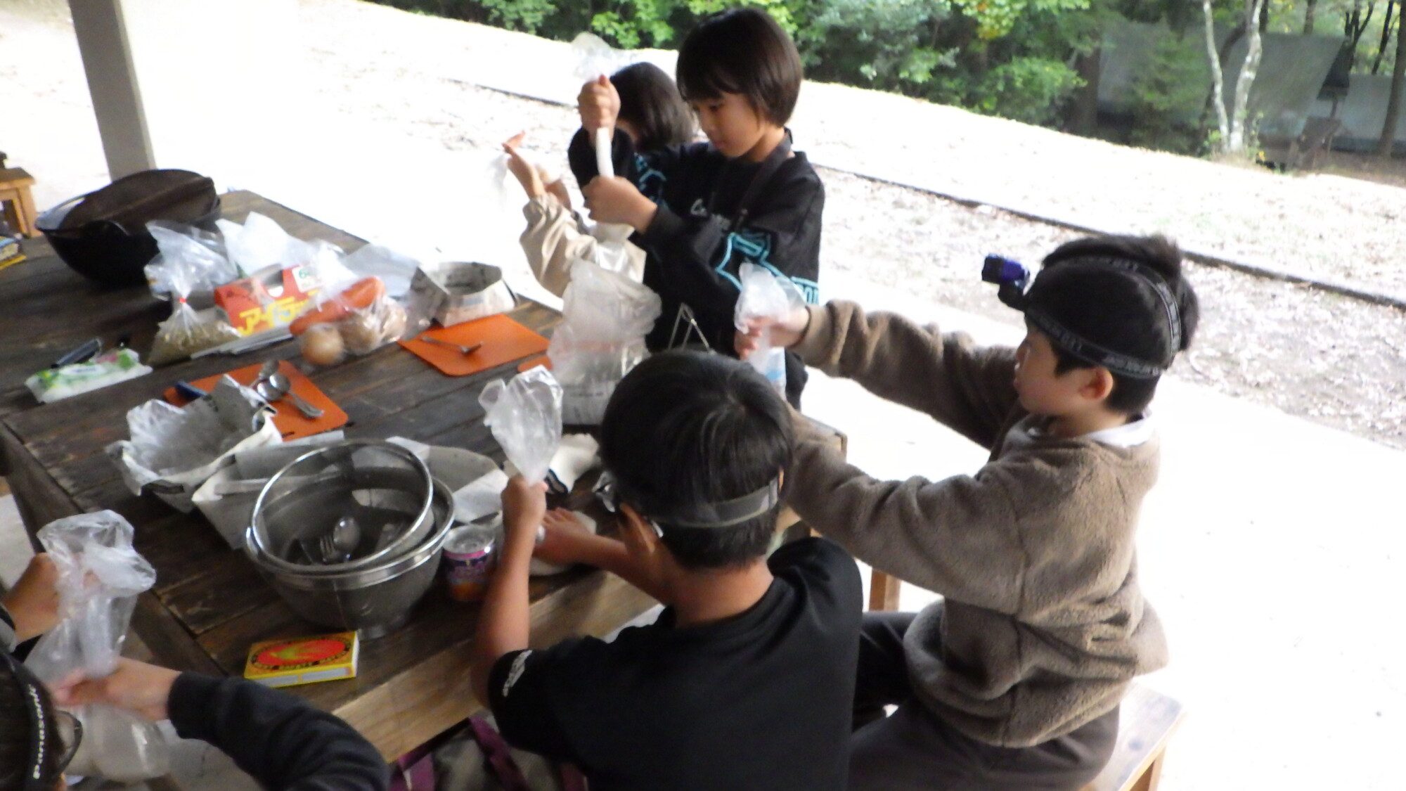 屋外の野外炊事場で、薪を割ったり、火を起こしたりして、調理に取り組みます。